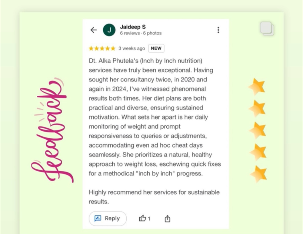 Dietician Alka is one of the best I have known since ..She has helped me in reducing my weight, inches ,belly fat ; besides providing me with my favourite foods. I would highly recommend her to all for their weight loss journey